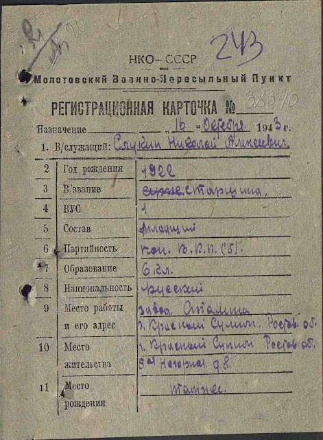 Дата и место призыва: 16.10.1941 г. Красносулинский ГВК, Ростовская обл., г. Красный Сулин